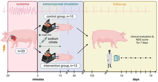 Immediately after the start of reperfusion, the animals received 40 mL of 7.45% potassium chloride for cardioversion. If necessary, this procedure was performed twice and, if unsuccessful, was followed by electrical cardioversion, as previously described by our group [25]. In the intervention group, additional sodium citrate was administered during the first 15 min of reperfusion to aim for an arterial ionized calcium level < 0.6 mmol/L.