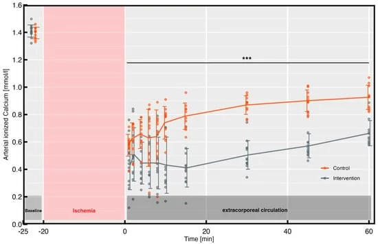 Appropriately, the minimum calcium level was found to be lower in the intervention group than in the control group (0.43 ± 0.17 mmol/L vs. 0.58 ± 0.08 mmol/L, p < 0.05). Different ionized calcium levels could be detected for up to 2 h after the start of reperfusion (intervention group: 0.90 ± 0.18 mmol/L vs. control group: 1.15 ± 0.14 mmol/L, p < 0.001).