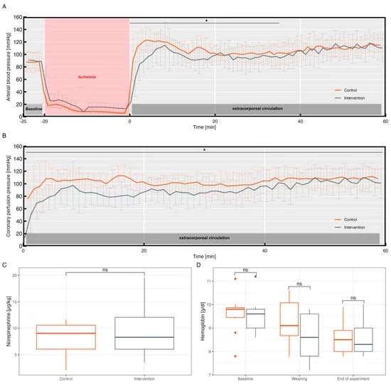 An increased bleeding propensity was not observed postoperatively in any of the animals. Appropriately, there were no group differences between the hemoglobin concentrations after weaning from ECC (intervention group: 8.6 ± 0.9 mg/dL vs. control group: 9.3 ± 0.9 mg/dL, p = 0.37), at the end of the experiment (8.6 ± 0.8 mg/dL vs. 8.6 ± 0.7 mg/dL, p = 1), or at baseline (9.5 ± 0.7 mg/dL vs. 9.6 ± 0.8 mg/dL, p = 1) (Figure 4D).