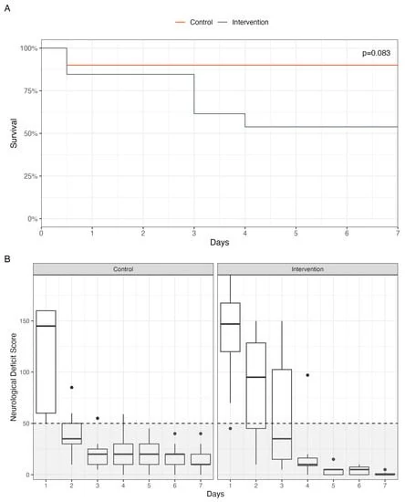 The neurological outcome measured by the NDS showed a good outcome (defined as an NDS < 50) in all animals that survived until day 7 of the experiment, with no difference between both groups (p = 0.87) (Figure 5B).